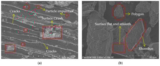 Scanning electron micrographs of biochar and phosphogypsum. (a) Scanning electron micrograph of biochar; (b) scanning electron micrograph of phosphogypsum.