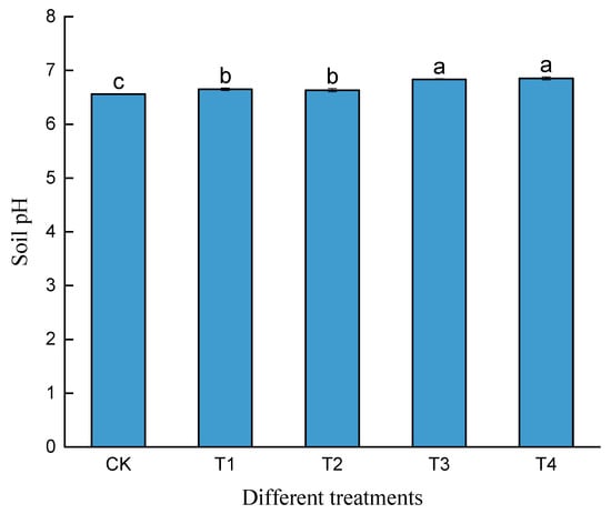 Effect of different treatments on pH of Cd-contaminated soil. No phosphogypsum and biochar (CK), no phosphogypsum + biochar application amount of 3000 kg/hm2 (T1), phosphogypsum application amount of 1500 kg/hm2 + biochar application amount of 3000 kg/hm2 (T2), phosphogypsum application amount of 3000 kg/hm2 + biochar application amount of 3000 kg/hm2 (T3), and phosphogypsum application amount of 4500 kg/hm2 + biochar application amount of 3000 kg/hm2 (T4). The values are the means ± standard deviations (n = 3). Different small letters indicate significant differences at the level of p < 0.05.