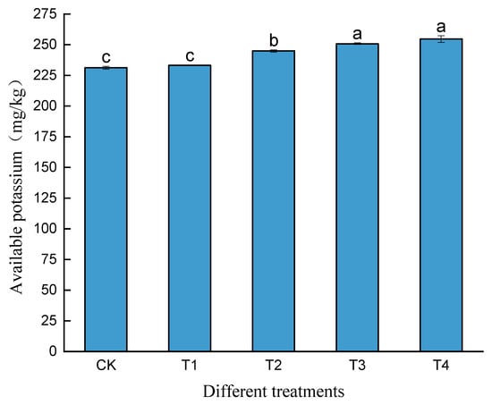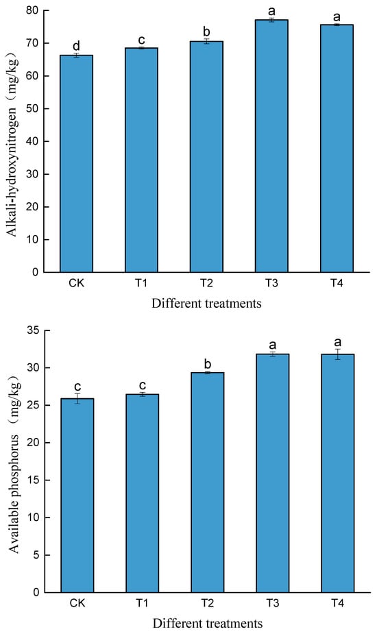 The effects of different treatments on the contents of alkali-hydrolyzable nitrogen, available phosphorus, and available potassium in the Cd-contaminated soil were different, as shown in Figure 3. The application of only biochar and the application of biochar with phosphogypsum increased the content of available phosphorus and available potassium in the Cd-contaminated soil and significantly increased the content of alkali-hydrolyzable nitrogen in the Cd-contaminated soil. Among all the treatments, compared with the CK treatment, the T3 and T4 treatments had the best effect on increasing the contents of alkali-hydrolyzable nitrogen, available phosphorus, and available potassium in the Cd-contaminated soil, which were significantly increased by 16.25%, 22.98%, and 8.50% and by 14.04%, 22.87%, and 10.13%, respectively, compared with the CK treatment. This shows that the application of 3000 kg/hm2 and 4500 kg/hm2 of phosphogypsum with biochar has the best effect on increasing the content of alkali-hydrolyzable nitrogen, available phosphorus, and available potassium in Cd-contaminated soil.