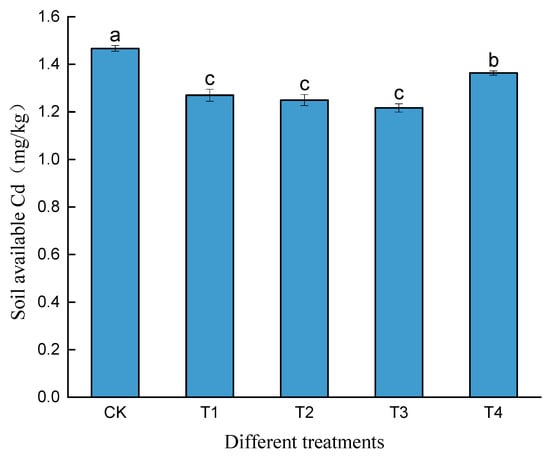 The effects of different treatments on the content of available Cd in Cd-contaminated soil. No phosphogypsum and biochar (CK), no phosphogypsum + biochar application amount of 3000 kg/hm2 (T1), phosphogypsum application amount of 1500 kg/hm2 + biochar application amount of 3000 kg/hm2 (T2), phosphogypsum application amount of 3000 kg/hm2 + biochar application amount of 3000 kg/hm2 (T3), and phosphogypsum application amount of 4500 kg/hm2 + biochar application amount of 3000 kg/hm2 (T4). The values are the means ± standard deviations (n = 3). Different small letters indicate significant differences at the level of p < 0.05.