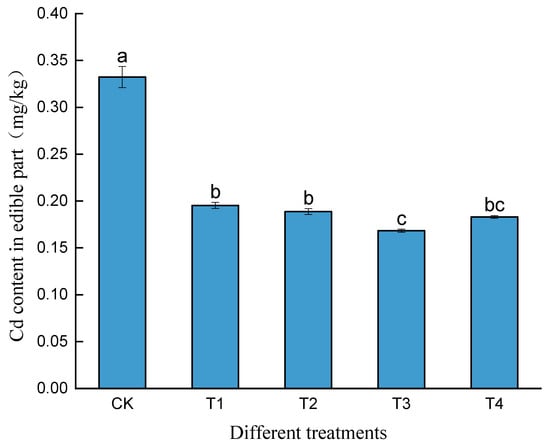 The effects of different treatments on Cd content in the edible part of Chinese cabbage. No phosphogypsum and biochar (CK), no phosphogypsum + biochar application amount of 3000 kg/hm2 (T1), phosphogypsum application amount of 1500 kg/hm2 + biochar application amount of 3000 kg/hm2 (T2), phosphogypsum application amount of 3000 kg/hm2 + biochar application amount of 3000 kg/hm2 (T3), and phosphogypsum application amount of 4500 kg/hm2 + biochar application amount of 3000 kg/hm2 (T4). The values are the means ± standard deviations (n = 3). Different small letters indicate significant differences at the level of p < 0.05.