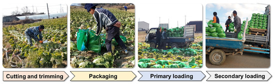 The current manual harvesting method, depicted in Figure 2, involves multiple labor-intensive steps, as follows: (1) after laying down the Napa cabbage head, cut off the stem with a knife and remove the outer leaves; (2) in packaging the cabbage heads, discard those with defects and pack high-quality cabbages in nets; (3) packaged Napa cabbage is loaded onto small trucks for primary loading; and (4) Napa cabbage is transferred from small trucks to larger trucks for secondary loading and distribution. This process, which typically involves five to six workers, is labor-intensive and highly susceptible to labor shortages. It can also lead to worker injuries, low product quality, and a high prevalence of musculoskeletal disorders (MSDs) [19,20,21].