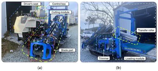 In this paper, we propose a self-propelled harvester for autonomous Napa cabbage harvesting, as shown in Figure 4. It integrates three key modules—cutting, attitude control, and loading, into the Napa cabbage harvester. The harvester includes enhancements to the cutting module, an optimized attitude control module, and a mechanized loading module. Key improvements include the following: (1) refining the conveyor and cutting mechanisms for better performance, (2) optimizing the attitude control module for more precise cutting, (3) designing a ton bag-type loading system for efficient handling, and (4) validating these improvements through field tests. The proposed harvester is expected to outperform manual labor in efficiency and effectiveness.