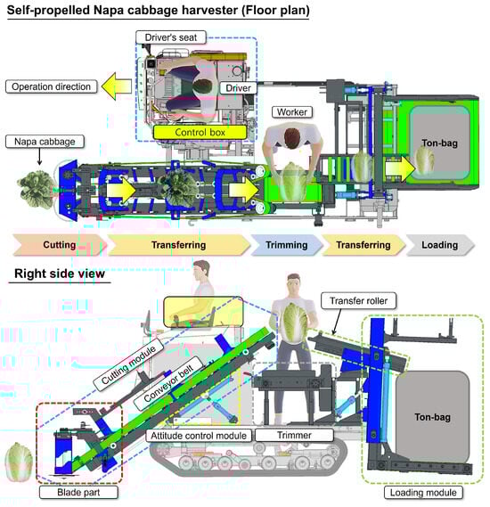 The proposed Napa cabbage harvester, depicted in Figure 5, integrates cutting, attitude control, and loading mechanisms to streamline and enhance harvesting efficiency. The harvester moves in the direction indicated by the arrow-labeled operation direction. It features a driver’s seat and a worker’s station, enabling semi-autonomous operation. The driver controls the movement of the harvester while the worker assists with manual tasks such as trimming.