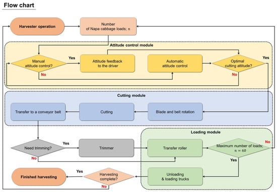 The proposed harvester represents the first successful integration of cutting, attitude control, and loading modules for Napa cabbage harvesting, offering a solution to address issues associated with traditional methods, such as worker injuries, low productivity, and high costs. Future work will focus on optimizing the harvester by automating decision-making criteria for various sequences using intelligent tools such as sensors, data analytics, and machine learning. Additionally, system efficiency will be evaluated across diverse scenarios, including different varieties and sizes of Napa cabbage, varying soil types and slopes, and different seasons and weather conditions.