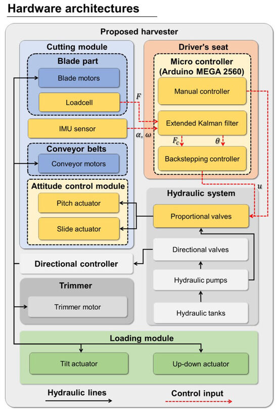 The hardware architecture, depicted in Figure 7, is built around a microcontroller (Arduino Mega 2560, Arduino.cc , Ivrea, Italy) that controls the entire system. Force control is provided by a load cell (CSBA-200L, CURIOTEC Co., Ltd., Paju, Republic of Korea) attached to the cutting device, while attitude feedback is given by an inertial measurement unit (IMU) sensor (MPU-6050, TDK InvenSense, San Jose, CA, USA) mounted on the cutting device. The hydraulic system features a manifold block with a proportional valve (4WREE 6E 32-re29061, Bosch Rexroth, Lohr am Main, Germany) and a directional valve (4WE6G6X/EG24N9K4, Bosch Rexroth, Lohr am Main, Germany). This system operates a 20 cc/rev hydraulic pump, drawing from a 170 L hydraulic tank, and powers the pitch and slide actuators, blade, conveyor, trimmer motor (120 rpm with 50 cc displacement), and the tilt and up-down actuators of the loading module (with 120 mm and 1000 mm strokes, respectively). These components ensure precise and reliable operation throughout the harvesting process.