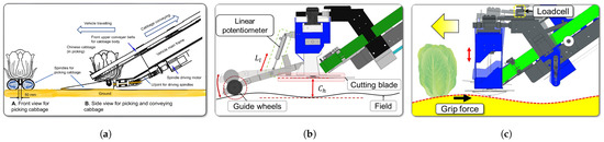 To address these issues, Park and Son (2022) introduced an attitude control system in the cutting module of Napa cabbage harvesters, significantly improving accuracy [18]. The implementation of this system led to a 37.0% improvement in cutting accuracy and efficiency, reducing errors, missed cuts, over-cuts, or side-cuts, thereby underscoring the crucial role in precise Napa cabbage harvesting, as shown in Figure 3.