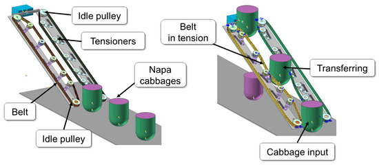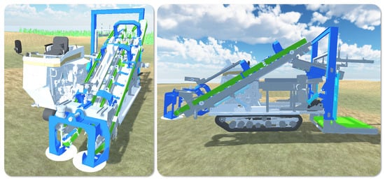 The right-side view illustrates the operational flow, from cutting, transferring, and trimming to transferring again and finally loading (Figure 5). This flow shows how the cabbage moves through each phase of the harvesting process, demonstrating the efficiency and integration of each module in the system.