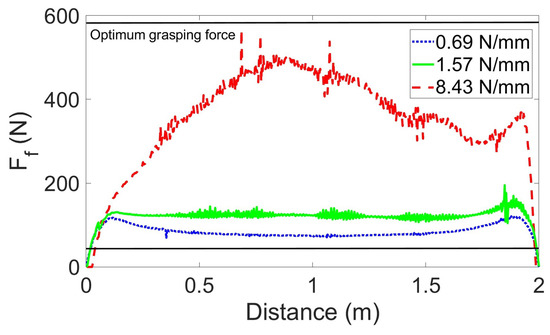 According to the simulation results (Figure 11), all three springs with different can be gripped within the optimal (44–580 N). Finally, a spring ( = 1.57 N/mm) with an intermediate value is selected to prevent the destruction.