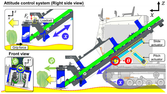 The attitude control system, shown in Figure 12, ensures that the cutting edge is leveled to the field and performs cutting at a constant height, thereby achieving stable harvesting of Napa cabbages.