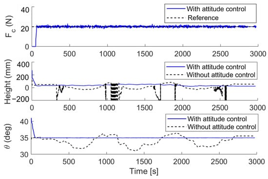 The performance of the automatic attitude control was evaluated, with root mean square errors (RMSEs) of 0.31º for and 22.65 N for , and mean absolute errors (MAEs) of 0.27º and 22.65 N, respectively. The harvesting scores improved by 5% (from 2.57 to 2.7) compared with previously reported results [35], demonstrating the effectiveness of the force-based attitude control.