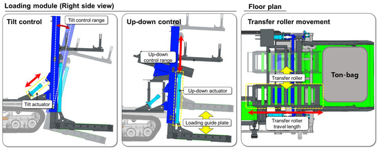 Using ton bags, designed to carry up to 1000 kg, may lead to Napa cabbages being damaged by compression during the loading process. To mitigate damage from falling, up–down control is incorporated into the loading design, as illustrated in Figure 16. Additionally, implementing a transfer roller aims to distribute the Napa cabbages more evenly within the bags. Despite these measures, the inherent nature of loading into ton bags still results in discrepancies in quality between the cabbages at the bottom and those at the top. The cabbages loaded initially may suffer from bruises, deformation, or tears in the leaves, negatively impacting the overall quality and shelf life.
