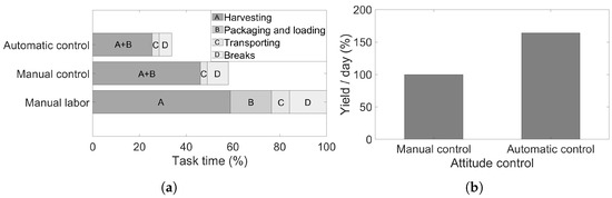The efficiency improvements of the proposed harvester in comparison with manual labor, as well as the differences between manual and automatic attitude control, are presented in Figure 18.