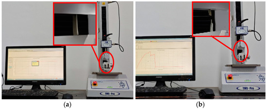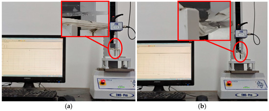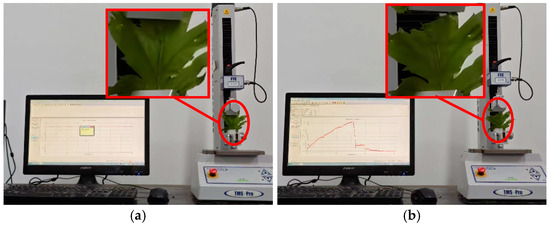 In order to obtain more accurate stress–strain curves, tensile or bending tests should be chosen according to the characteristics of different parts of the mugwort. The tensile test was used for mugwort stems and mugwort leaves, while the three-point bending test was used for mugwort branches. A number of fresh mugwort samples were randomly selected and the branches, stems, and leaves were intercepted, and the tests were repeated five times in order to eliminate errors and the average values were taken. The tensile tests of mugwort stems and leaves are shown in Figure 2 and Figure 3, respectively. The stems and leaves were placed on the fixture used for tensile testing, and the tensile tests were carried out on the mass spectrometer. The bending test of the mugwort branch is shown in Figure 4, in which the red box shows the local enlargement of the test object. The bending test was carried out by placing the mugwort branch on the fixture used for bending on the mass spectrometer.