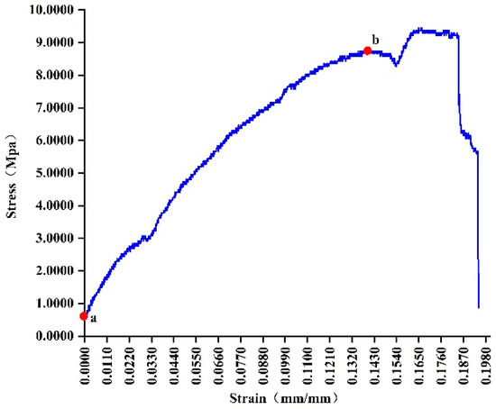 The cross-sectional area of the mugwort stem is the average of the maximum and minimum semi-circular cross-sectional areas of the mugwort stem, and the stress–strain curve of the mugwort stem is shown in Figure 5. Point b is the yield point in the figure, and the elastic stage is between point a and point b, where the mugwort stem deforms linearly. After point b, the mugwort stem enters the yield stage. In the elastic stage, the modulus of elasticity of the mugwort stem can be found according to Equation (3), as shown in Table 1.