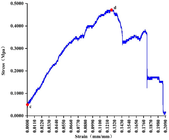 The cross-sectional area of a mugwort leaf is the average of its maximum and minimum rectangular cross-sectional areas, and the stress–strain curve of the mugwort leaf is shown in Figure 6. In the figure, point d is the yield point, and the mugwort leaf is deformed linearly in the elastic stage between point c and point d. After point d, the mugwort leaf enters the yield stage. In the elastic stage, the modulus of elasticity of the mugwort leaf can be found according to Equation (3), as shown in Table 1.