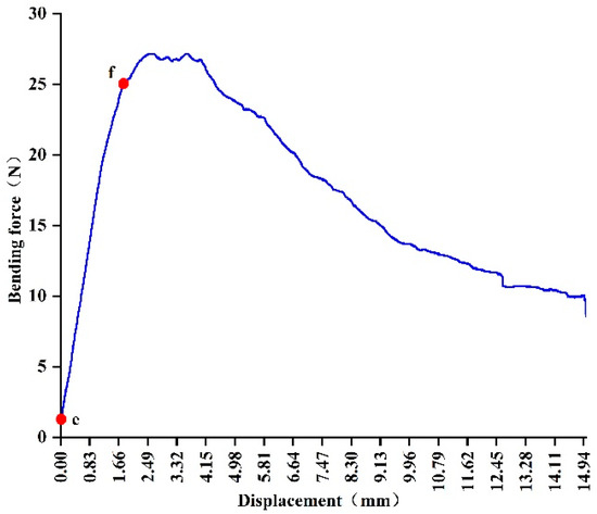 The bending force–displacement curves of the mugwort branch are shown in Figure 7. In the figure, the elasticity stage is between point e and point f, and the mugwort branch deforms linearly. After point f, the mugwort branch enters the yielding stage. In the elastic phase, the modulus of elasticity of the mugwort branch can be found according to Equation (5), as shown in Table 1.