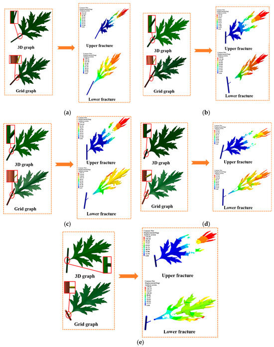 In Figure 8, the left side is the mugwort pre-processing model, the upper left side is the mugwort 3D model, the lower left side is the mugwort grid model, and the red box is the local enlargement of the angle between the mugwort stem and the mugwort branch. The right side of the figure shows the simulation visualisation, with the harvesting simulation location on the upper right side in the upper part and the harvesting simulation location on the lower right side in the lower part. The angle between the stem and branch set in Figure 8a is less than 5°, which can be approximated as 0° in the harvesting simulation, and the angles set in Figure 8b–e are 30°, 45°, 60°, and 90°, respectively. The leaf folds appearing in the simulated viewable images are due to the biological properties of mugwort itself, as the naturally grown leaves are not in an absolute plane, whereas the velocity applied when performing the harvesting simulation is in an absolute plane; hence, the folds appear, but they have no effect on the location of leaf breakage.