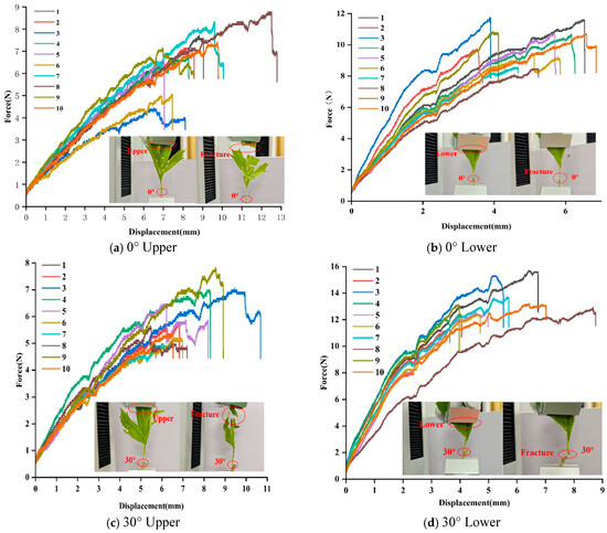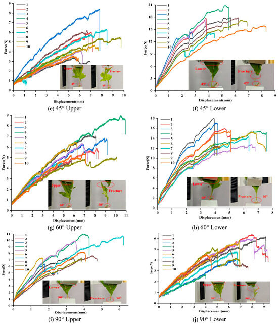Harvesting tests of mugwort were conducted from different angles and locations to verify the accuracy of the simulation results. The experimental mugwort was taken from Caohe Town, Herb County, Hubei Province, and harvested on 13 May 2024. Harvesting tests of mugwort were conducted using a texture meter to measure the harvesting force. The harvesting test at different angles refers to the test conducted from five different directions, such as 0°, 30°, 45°, 60°, and 90°, respectively. Harvesting tests at different positions were conducted from two different positions including near the top of the mugwort leaf and the mugwort stem, respectively. The position near the top of the mugwort leaf is referred to as the upper part, and the position near the mugwort stem is referred to as the lower part. The harvesting trials at different angles and different positions are shown in the red dashed circle boxes in Figure 9. The 10 curves in Figure 9a–j are from 10 tests conducted to eliminate errors, while the curves represent the force and displacement. Figure 9a shows that the harvesting angle was 0° and the harvesting position was in the upper position. Figure 9b shows that the harvesting angle was 0° and the harvesting position was in the lower position. Figure 9c shows that the harvesting angle was 30° and the harvesting position was in the upper position. Figure 9d shows that the harvesting angle was 30° and the harvesting position was in the lower position. Figure 9e shows that the harvesting angle was 45° and the harvesting position was in the upper position. Figure 9f shows that the harvesting angle was 45° and the harvesting position was in the lower position. Figure 9g shows that the harvesting angle was 60° and the harvesting position was in the upper position. Figure 9h shows that the harvesting angle was 60° and the harvesting position was in the lower position. Figure 9i shows that the harvesting angle was 90° and the harvesting position was in the upper position. Figure 9j shows that the harvesting angle was 90° and the harvesting position was in the lower position.