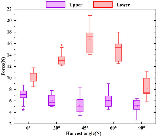 From the point of view of the harvesting force, it can be seen from Figure 10 that when the harvesting position is in the upper part, the harvesting force is small; at this time, the change in the harvesting angle has little effect on the harvesting force. When the harvesting position is in the lower part, the harvesting force is larger, and the effect of the change in harvesting angle on the harvesting force is more significant; the harvesting force gradually increases from 0° to 45°, and the harvesting force gradually becomes smaller from 45° to 90°, and the harvesting force is the largest when it is around 45°. Under the same harvesting angle, the harvesting force required when the harvesting position is in the lower part is greater than that in the upper part.
