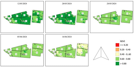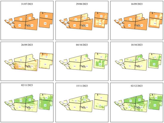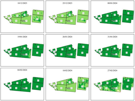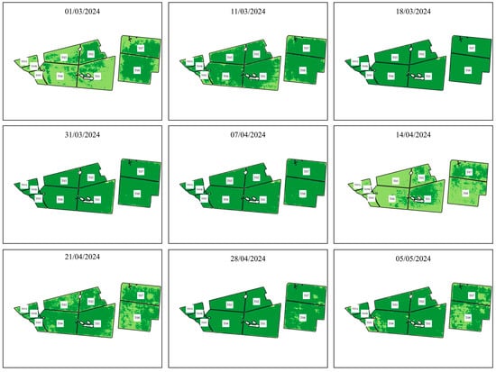 For the analysis of vegetation temporal variation, the collection of NDVI values was carried out on several dates. The images used to calculate the NDVI were obtained from the Planet satellite constellation, which provides high-resolution images with high temporal frequency, which is crucial for monitoring rapid changes in vegetation.