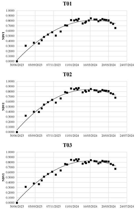 To model the variation of the NDVI over time, it was decided to adjust a second degree equation to the collected data. The second degree polynomial regression was chosen for its ability to capture the nonlinear trend of NDVI data over the different observed dates. The function to be adjusted is of the type shown in Equation (2):