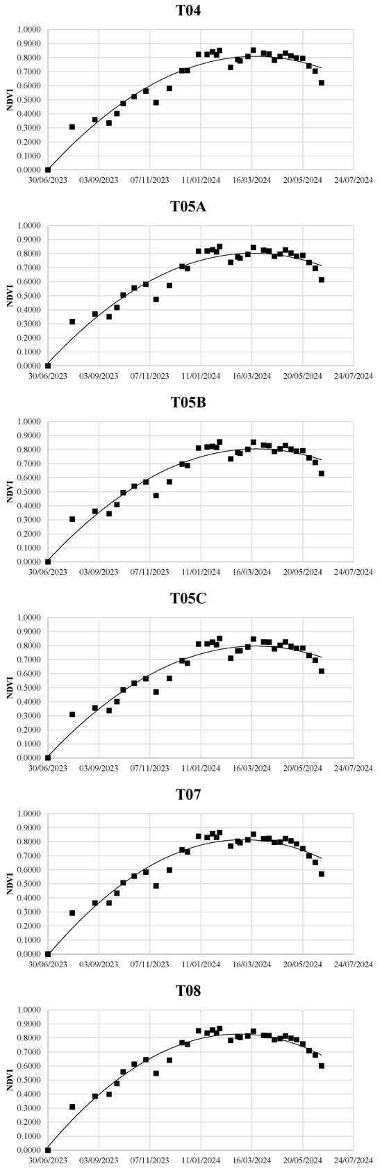 Using second-degree polynomial regression techniques, curve adjustment to the data was performed to find the values of the coefficients a, b, and c that best describe the variation of NDVI over time. The Real Statistics software version 8.9, an additional tool for Excel, was used to perform the polynomial regression.