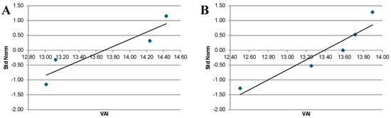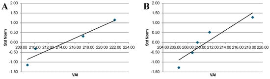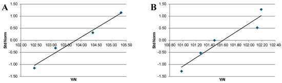 From the VAI obtained for each plot, a test was performed to verify the normality of the data. Testing for normality is a crucial step in many statistical methods, since many tests assume that the data follow a normal distribution. For this, the Shapiro–Wilk Test and QQ (quantile–quantile) plot were used, which are common and complementary approaches to evaluate the data normality.