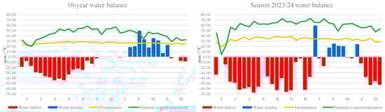 Complementarily, although biostimulants play a fundamental role in mitigating stresses by enhancing plants’ water retention and improving water use efficiency—helping them withstand drought periods and boost resistance to extreme temperatures by protecting cells from heat-induced damage [29,30,31]—when comparing the 10-year and the 2023/2024 season water balance, calculated using the climatological water balance method of Thornthwaite and Mather (1955) (Figure 11), the data show that during the post-treatment period, the average temperature was 5.54 °C higher in 2023/2024, and the average potential evapotranspiration was 14.41 mm higher than the 10-year period.