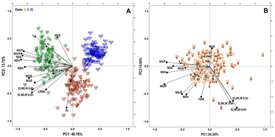 Principal component analysis (PCA) presented as a biplot (projection of variables and projection of cases) on the plane of the first two factor axes performed for variables differentiating the tested genotypes of winter wheat in terms of parameters related to the excised-leaf water loss (ELWLW 0–3 h, ELWLW 3–6 h, ELWLW 0–6 h), yield components (number of grains/ear (NG/E), number of grains/plant (NG/P), weight of grains/ear (WG/E), weight of grains/plant (WG/P), number of days to heading (NDH), number of days to anthesis (NDA), tillering (T), main shoot height (MSH), thousand grain weight (TGW)) and selected physiological parameters (osmotic potential (Ψo), electrolyte leakage (EL), water use efficiency (WUE), leaf relative water content (LRWC)). The graph shows a common analysis for all genotypes from the three sowing dates (A) and a separate analysis for the average values of the three sowing dates calculated for all genotypes and for each parameter (B).