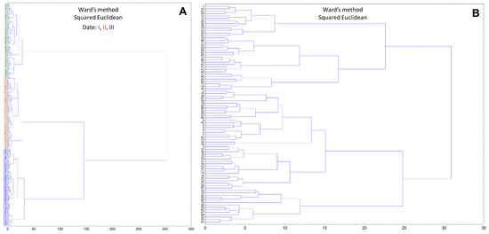 Dendrogram of 90 winter wheat genotypes resulting from cluster analysis (Ward’s method) of parameters related to excised-leaf water loss (ELWLW 0–3 h, ELWLW 3–6 h, ELWLW 0–6 h), yield components (number of grains/ear (NG/E), number of grains/plant (NG/P), weight of grains/ear (WG/E), weight of grains/plant (WG/P), number of days to heading (NDH), number of days to anthesis (NDA), tillering (T), main shoot height (MSH), thousand grain weight (TGW)) and selected physiological parameters (osmotic potential (Ψo), electrolyte leakage (EL), water use efficiency (WUE), leaf relative water content (LRWC)). The graph shows a common analysis for all genotypes from the three sowing dates (A) and the average values of the three sowing dates (B).