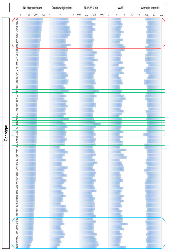 Ranking of the tested winter wheat genotypes according to decreasing yield, expressed as the number of grains per plant, in comparison with the grain weight per plant and selected physiological parameters (ELWLW 0–6 h, WUE, osmotic potential). The 30 genotypes selected for further study were marked with colored boxes according to the highest, average and the lowest number of grains per plant.