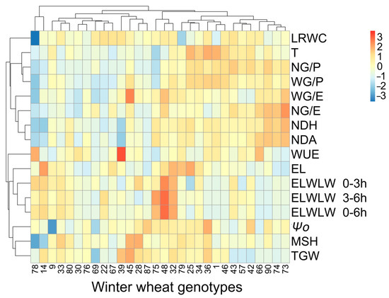 Heatmap and cluster analysis of parameters related to excised-leaf water loss (ELWLW 0–3 h, ELWLW 3–6 h, ELWLW 0–6 h), yield components (NG/E, NG/P, WG/E, NDH, NDA, T, MSH, TGW), and physiological parameters (Ψo, EL, WUE). The heatmap differentiates 30 selected winter wheat genotypes at all sowing dates. Each row represents a different variable and each column represents a different wheat genotype. The color scale presents Z-scores for individual values. The intensity of the color shows the differences in the amount of the value within the given parameter between the genotypes. A darker red color represents a higher and a darker blue color represents a lower value within each parameter being represented in the heatmap. Analyzed parameters: ELWLW 0–3 h, ELWLW 3–6 h, ELWLW 0–6 h—excised-leaf water loss; NG/E—number of grains/ear; NG/P—number of grains/plant; WG/E—weight of grains/ear; WG/P—weight of grains/plant; NDH—number of days to heading; NDA—number of days to anthesis; T—tillering; MSH—main shoot height; TGW—thousand grain weight; Ψo—osmotic potential; EL—electrolyte leakage; WUE—water use efficiency; LRWC—leaf relative water content.
