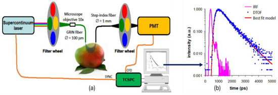 (a) Scheme of the system used for TRS measurements on mango fruit (GRIN: graded-index; PMT: photomultiplier tube; SYNC: synchronization signal; CFD: constant fraction discriminator signal; TCSPC: time-correlated single-photon counting board). (b) Exemplum of the best fit of the model (red line), describing photon diffusion in a turbid medium on the measured DTOF (distribution of photon time-of-flight, blue dots) and after convolution with the IRF (instrument response function, pink line).
