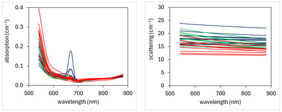Scattering spectra were flat and slightly decreased with increasing wavelength, as predicted by the Mie theory (Figure 2, right). The range of variation was 12.0–23.9 cm−1 at 540 nm and 11.6–22.06 cm−1 at 880 nm.