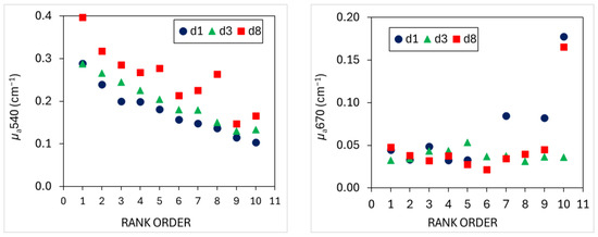 Considering the variation of µa540 and µa670 according to the rank order (Figure 3), the least mature fruit, corresponding to R10 mangoes after 1d at 20 °C showed the highest values of µa670 coupled with the lowest values of µa540. The µa670 showed very high values also for the R7 and R9 fruits after 1d of shelf-life, while no reliable measurements at 670 nm were obtained for the R6 and R8 fruits, probably due to the strong absorption of the green layer under the skin typical of immature mangoes, which strongly reduced the number of detected photons at 670 nm [49]. On the contrary, most mature fruits, i.e., R1 mangoes after 8d at 20 °C, showed the highest values of µa540 coupled with low values of µa670.