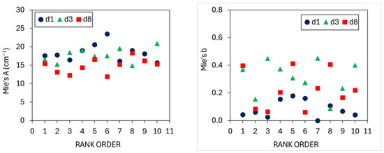 Mie’s A ranged from 11.9 to 23.5 cm−1 and Mie’s b from 0 to 0.45 (Figure 4). No clear trend could be found for Mie’s A and b according to rank order (Figure 4).