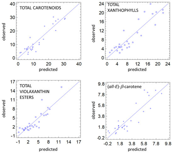 Measured and predicted total carotenoids, total xanthophylls, total violaxanthin esters, and (all-E)-β-carotene using multi regression analysis. The models’ details are reported in Table 6.