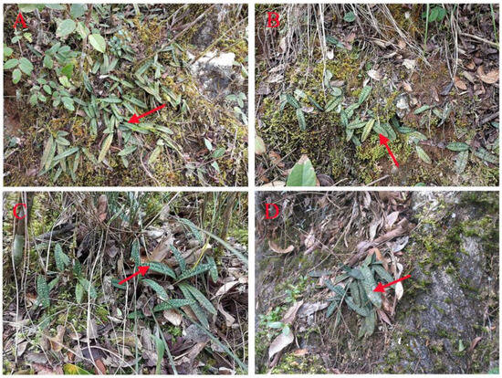Different habitats of P. micranthum in different locations: (A) under tree base in Shedu—SDT; (B) under tree base in Xiaobazi—XBZT; (C) under shrub base in Xiaobazi—XBZS; (D) lithophyte in Xiaobazi—XBZL. Red arrows in the pictures showed the individuals of P. micranthum.