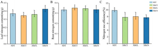 The nitrogen content across different habitats of P. micranthum was determined (Figure 2). Leaf nitrogen content ranged from 0.37 mg/g to 0.424 mg/g, with XBZS exhibiting significantly higher leaf nitrogen content (0.424 mg/g) compared to the other three habitats (p < 0.05). Root nitrogen content ranged from 0.33 mg/g to 0.35 mg/g, and there were no significant differences observed among the four habitats (p > 0.05). Comparison of leaf nitrogen and root nitrogen revealed varying trends. The nitrogen-use efficiency of P. micranthum ranged from 7.73% to 9.87%. Nitrogen-use efficiency among the four plot types was compared (Figure 2), showing that the SDT habitat had significantly higher nitrogen-use efficiency than the other three habitats (p < 0.05). However, there were no significant differences in nitrogen-use efficiency observed among same regions within the different habitats.