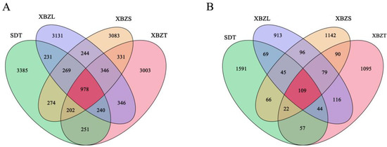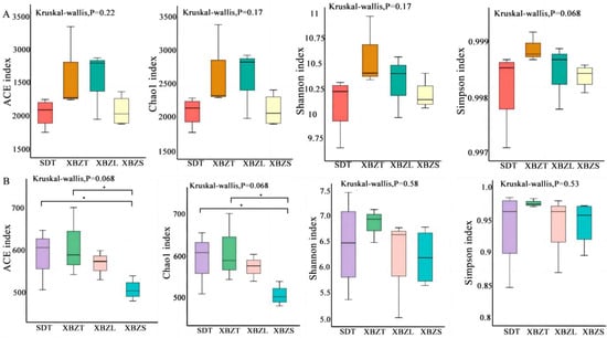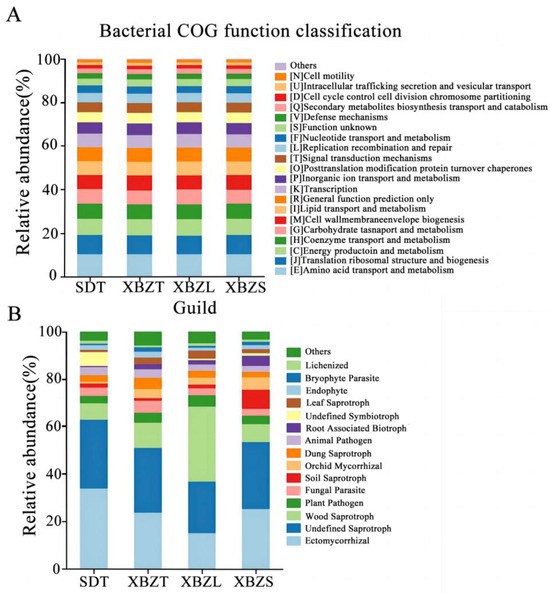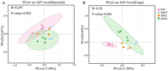 PCoA based on Bray Curtis distance revealed the dissimilarities in species composition among soil samples from different habitats of P. micranthum. For bacteria, PCoA of the 16S sequencing data showed that PCo1 and PCo2 contributed 17.09% and 12.01% to the total variance, respectively, explaining a combined 29.1% of the variation (Figure 5A). For fungi, PCoA of the ITS sequencing data indicated that PCo1 and PCo2 contributed 11.98% and 9.63% to the total variance, respectively, explaining a combined 21.61% of the variation (Figure 5B). The Anosim analysis indicated significant differences in microbial community composition between soil samples (Table S1). Bacterial and fungal community diversity showed significant differences (p < 0.05) between SDT and XBZT, XBZS.