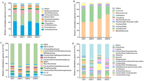 Composition map of the main soil microbial groups at the phylum level and genus level in different habitats of P. micranthum. (A) Phylum-level composition of the bacterial community. (B) Phylum-level composition of the fungal community. (C) Genus-level composition of the bacterial community. (D) Genus-level composition of the fungal community.