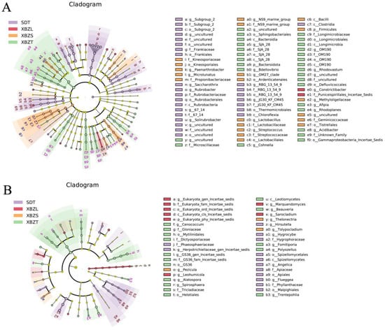 LEfSe analysis of microbial abundance in four rhizosphere soil samples. Cladogram showing taxa with different abundance values of bacterial (A) and fungal (B) community. Taxa from various sites are depicted as colored dots.