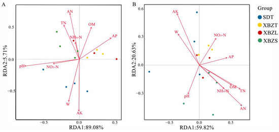 Redundancy analysis (RDA) of soil properties and bacterial (A) or fungal (B) community in rhizosphere soil of P. micranthum.