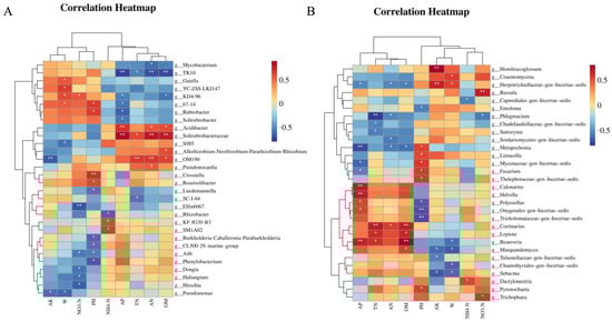 Heatmaps showing correlations between soil factors and the first 30 genera of bacteria (A) and fungi (B). Color depth represents the magnitude of the correlation R value. * means significant correlation at the 0.05 level; ** means significant correlation at the 0.01 level.