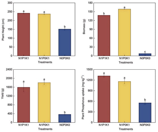 The N1P1K1 treatment served as the control (CK). Figure 1 reveals that there was no statistically significantly disparity in cucumber plant height, yield, or phosphorus uptake between the N1P0K1 and CK treatments. However, the cucumber biomass in N1P0K1 was notably elevated compared to CK. In contrast, N0P0K0 exhibited a marked decrease in cucumber plant height, yield, biomass, and P uptake when compared to CK. The findings underscore that N1P0K1 significantly surpassed N0P0K0 in terms of cucumber plant height, yield, biomass, and phosphorus uptake.