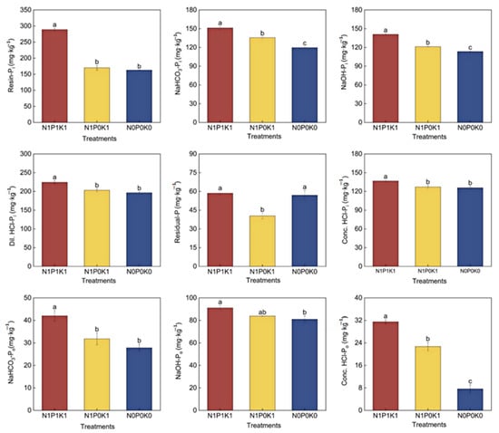 Research has indicated that soil Pi serves as the primary source for P uptake by plants, and alterations in its content and morphology can serve as indicators of the soil’s P availability [45]. In this study, soil P fractions were determined using the Hedley P extraction method revised by Tissen. After four crops in pot trials, it was found that the contents of labile Pi (Resin-Pi and NaHCO3-Pi) and moderately labile Pi (NaOH-Pi and Dil. HCl-Pi) were significantly reduced in the N1P0K1 and N0P0K0 treatments, indicating that these four P fractions were the main sources of the P absorbed and utilized by plants (Figure 2). The reason for this was that Resin-Pi and NaHCO3-Pi represent the most effective soluble Pi for plants, and they can be directly absorbed and utilized by crops [46]. NaOH-Pi is Pi that has been adsorbed on amorphous aluminum–iron oxides; it is considered as moderately labile P and can also be used by plants after desorption. Dil. HCl-Pi is a calcium-bound compound, and it is mainly related to primary apatite minerals. Both Dil. HCl-Pi and NaOH-Pi are moderately labile Pi, accounting for a large proportion of TP, and they have high P activity. Under the condition of a long-term lack of P application, they can be converted into other forms as a source of P for crop uptake and use under long-term no P application [47]. Continued application of P in P-rich soil will cause a large amount of soil Pi to accumulate, mainly through the accumulation of Resin-P. This finding is congruent with prior research that found that a large amount of labile P is released when chemical P fertilizer is applied to the soil [48].
