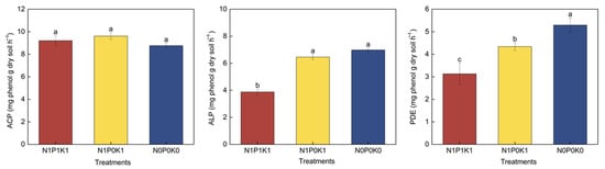 Compared with N1P1K1, ALP activity was increased by 80.14% and 66.55%, and PDE activity was increased by 69.12% and 38.66% in N1P0K1 and N0P0K0, respectively (Figure 3).