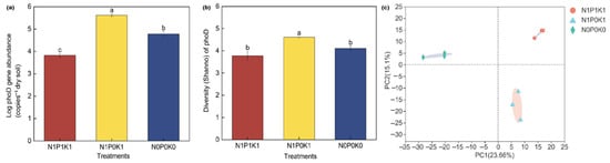 Reducing P fertilizer affected soil phoD gene abundance; the phoD gene abundance of N1P0K1 and N0P0K0 were significantly higher than CK by 46.95% and 25.00% (Figure 4a). The sequences obtained after high-throughput sequencing and quality control with 97% similarity were aligned and annotated with the NT database. Shannon index was used to represent the phoD bacterial community diversity. The Shannon indexes of the N1P1K1, N1P0K1, and N0P0K0 treatments were 3.46, 4.62, and 4.11, respectively. The Shannon indexes of the N0P0K0 and N1P0K1 treatments were significantly higher than that of the N1P1K1 treatment (Figure 4b). According to the PCA analysis conducted, it was observed that various P fertilizer reduction treatments exerted a notable impact on the phoD-harboring bacterial communities. The first component analysis yielded an explanatory degree of 23.53%, revealing a statistically significant difference between the N0P0K0 and the N1P0K1 treatments as well as N1P1K1 treatments. Furthermore, the second component analysis demonstrated a 14.56% explanatory degree, with a significant distinction observed between the N1P0K1 treatment and the N0P0K0 as well as N1P1K1 treatments (Figure 4c).