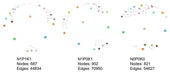 The proteobacteria phylum emerged as the dominant phoD-harboring phylum, accounting for 15.38% to 22.28%. Within this dominant phylum, no notable variation in abundance was observed between the N1P0K1 and N1P1K1 treatments. However, the abundance of proteobacteria in the N0P0K0 treatment was markedly lower compared to the N1P0K1 and N1P1K1 treatments (Table S5). Figure 5 presents an analysis of the species composition and sample cluster tree of the top 12 total abundance of phoD-harboring bacterial communities at the genus level within the soil of the greenhouse cucumber under reducing P fertilizer treatments. The findings indicate a greater similarity in the dominant genera composition of the soil under N1P1K1 and N1P0K1 treatments. In the context of the phoD-harboring bacterial community, the prevalent genera were Bradyrhizobium (10.63–14.91%), Shinella (0.01–3.08%), and Ensifer (0.12–1.27%) (Figure 6). A comparative assessment with the N1P1K1 treatment revealed that both the N1P0K1 and N0P0K0 treatments significantly decreased the abundance of Bradyrhizobium and Shinella while significantly elevating the abundance of Ensifer. An analysis of the network’s topological properties showed that network node connectivity in the N1P0K1 and N0P0K0 treatments was higher than N1P1K1 treatment (Figure 7).